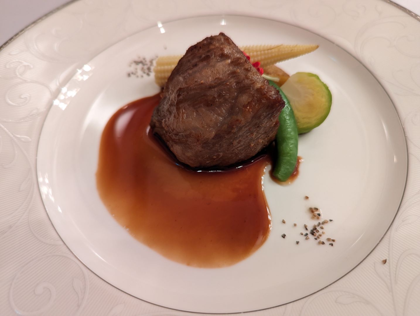 肉料理: 富良野産 ふらの和牛サーロインのロティ「黒」ワインのソース カシス風味