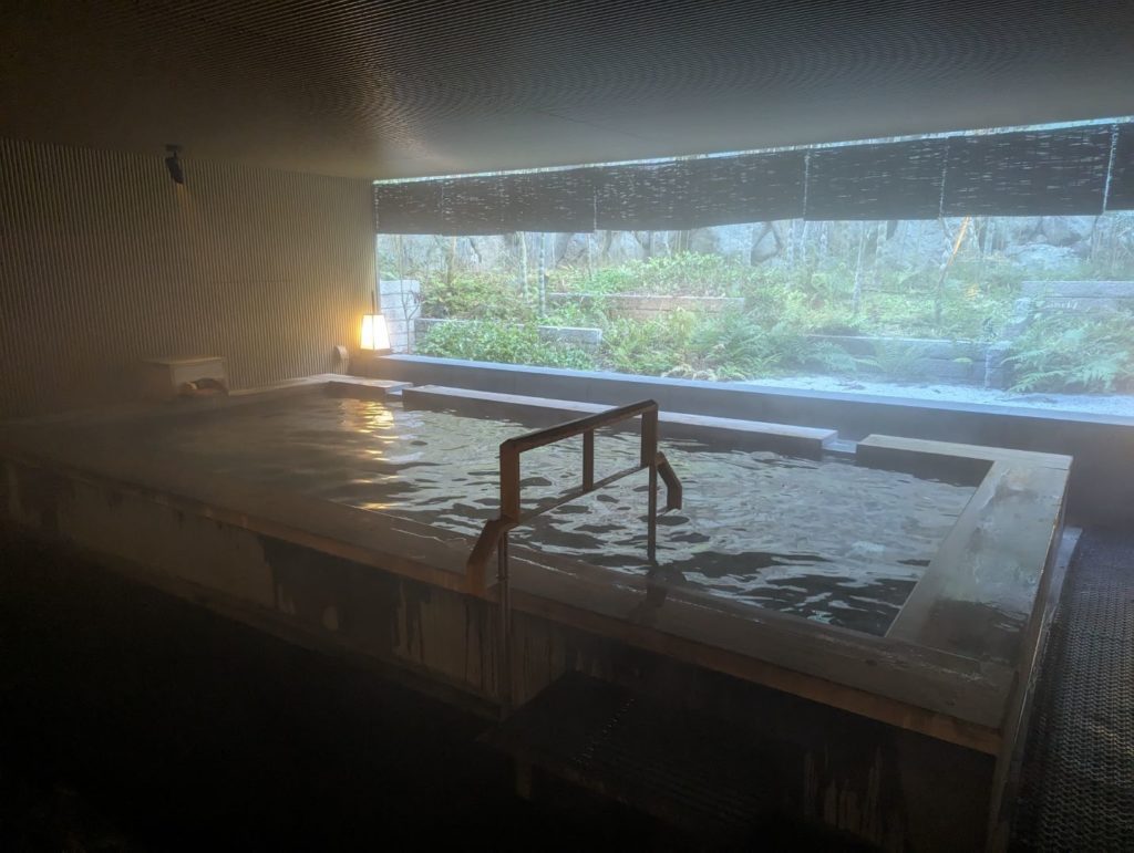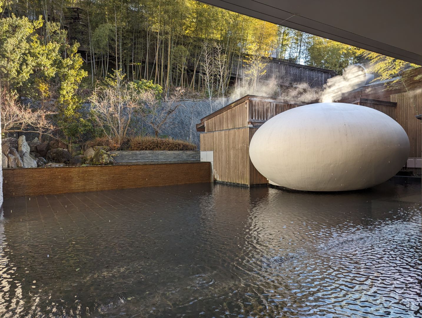ちょっとおもしろいのは、大浴場の「宙 – Sora -」は露天風呂が不思議な楕円形の空間に湯が張られているところにつながっていること。真っ白な楕円形の空間は、まるで瞑想をするような場所。正面には竹林が見えるのもいい感じ。