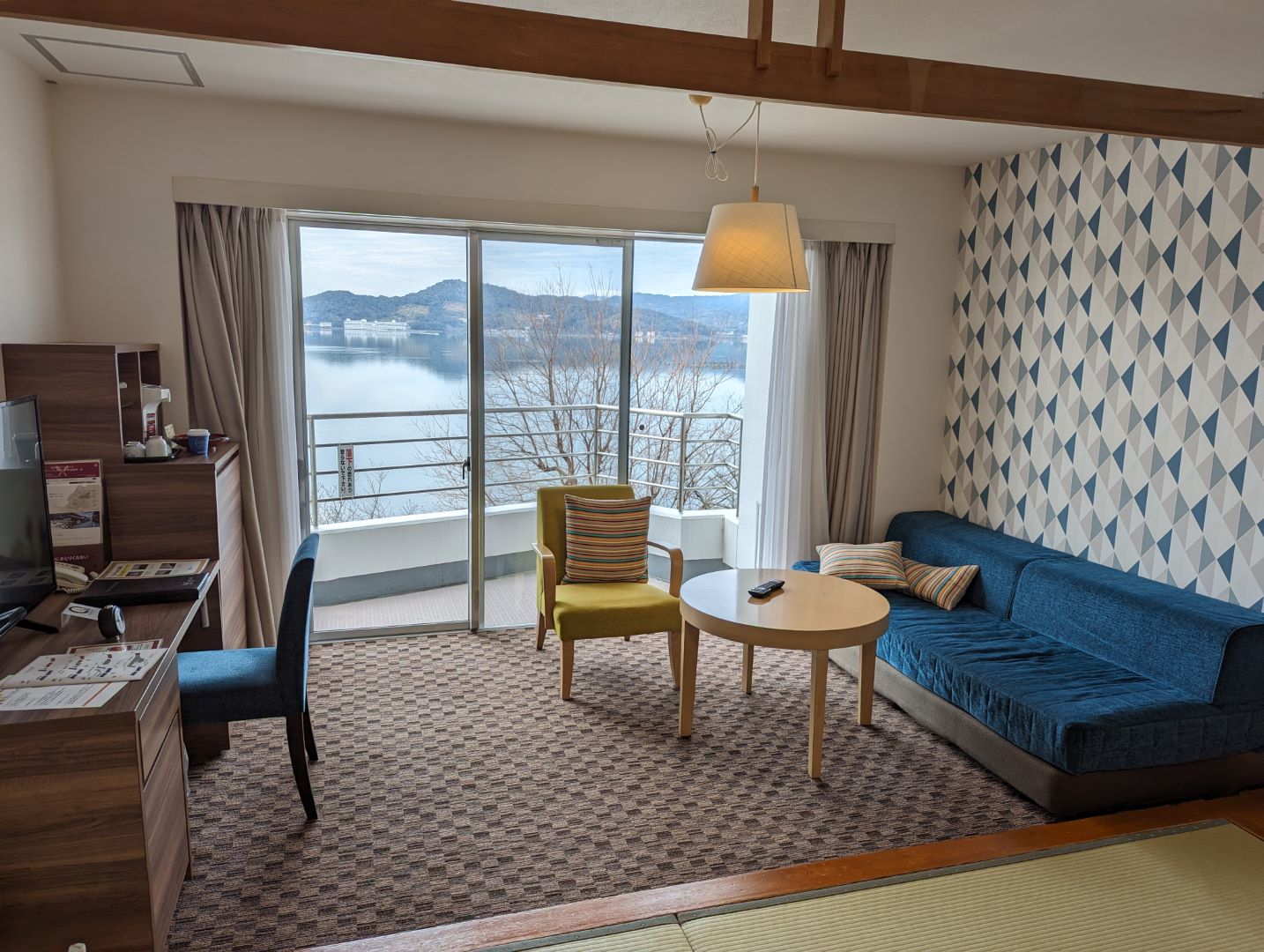 部屋からは浜名湖が一望できて、浜名湖をサイクリングするときに時々走っているルートも良く見える。この日は雁の群れが V字になって何度もこのあたりを飛んでいたのが印象的でした。