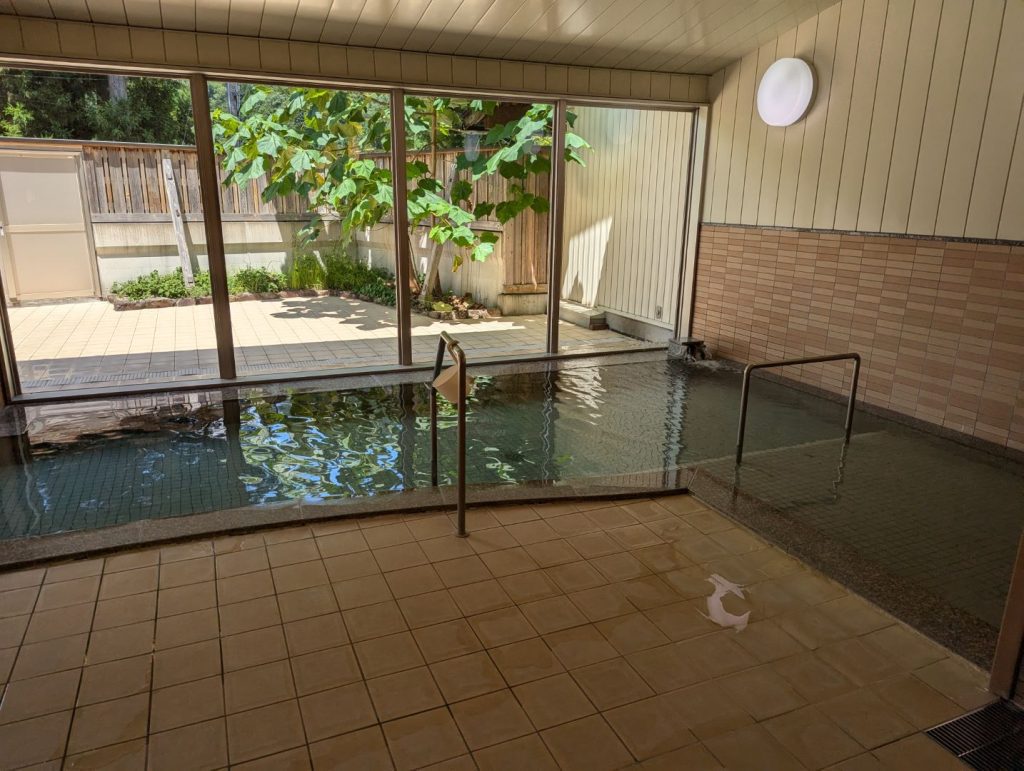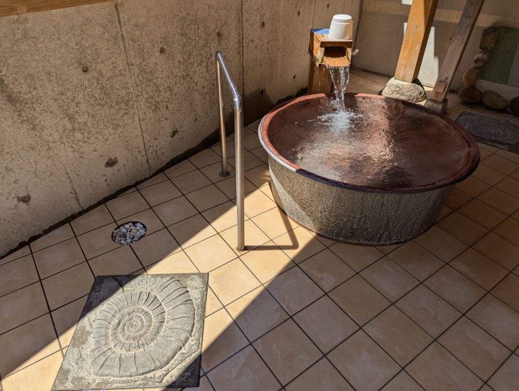 この日はラッキーなことに、誰一人としてお客さんがおらず広々とした温泉を独り占め。無色透明のお湯で、源泉の温度は 26度で成分総量は 302mg / kg。泉質は、入ると肌がつるつるするアルカリ性単純温泉でわりとさっぱり目の化粧水のような感じで、湯上がりがさらっとして気持ちが良い。このあたりは福井の恐竜博物館なども近くて化石が出るような場所だからか、露天風呂にはアンモナイトの化石(のレプリカ?)が。夏の暑い日だったけど、日よけがあり風が抜ける露天風呂はなかなかに気持ちが良い。贅沢を言うなら、源泉をそのままの温度で入れるような湯船があったりしたら最高なんだけど。