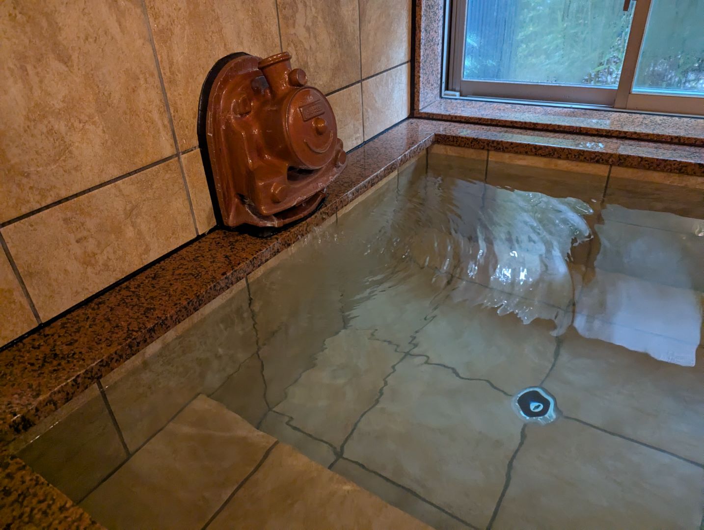 源泉の温度は 43度あり、成分総計 635.6mg / kg、pH9.1 の単純硫黄温泉。以前来たときのブログにも書いたけれど、わりとはっきりと硫黄臭を感じるお湯って、硫化水素型のお湯として強酸性のお湯を想像しがちだけれど、こういうお湯もあるのが面白い。