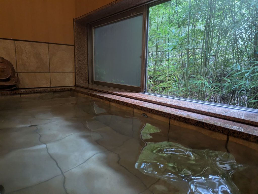 貸し切りの湯船は、おそらく2つあるようで、1つあたり最大で4人くらい入れそうな感じのこじんまりとしたものでした。残念ながら美しい山の景色を見ながらというわけにはいかないけど、庭の緑を眺めながら外のひんやりとした空気を感じながらゆっくりできました。寸又峡のお湯は、びっくりするほどぬるぬるすべすべのお湯で、何度体験してもこの濃厚なとろりとしたお湯には驚かされます。床が滑りやすくて気をつけないと転びそうになります。