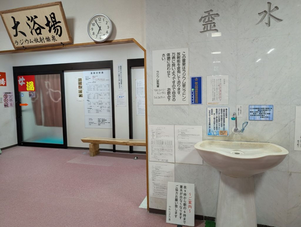 真っ暗な中で到着すると、割と大きな旅館という感じで自炊で長期滞在して湯治することもできるようでした。どうも温泉よりもラジウムの岩盤浴を押しているみたい。この手の放射能泉で長期滞在というと、自分が行ったことがある場所だと、秋田の玉川温泉や鳥取の三朝温泉みたいな感じかな。玉川温泉は治療のために湯治に来ている方がすごくたくさんいて、ちょっと独特というか異様な雰囲気があるけど、ここは夜だったからも知れないけどそれは無かった。