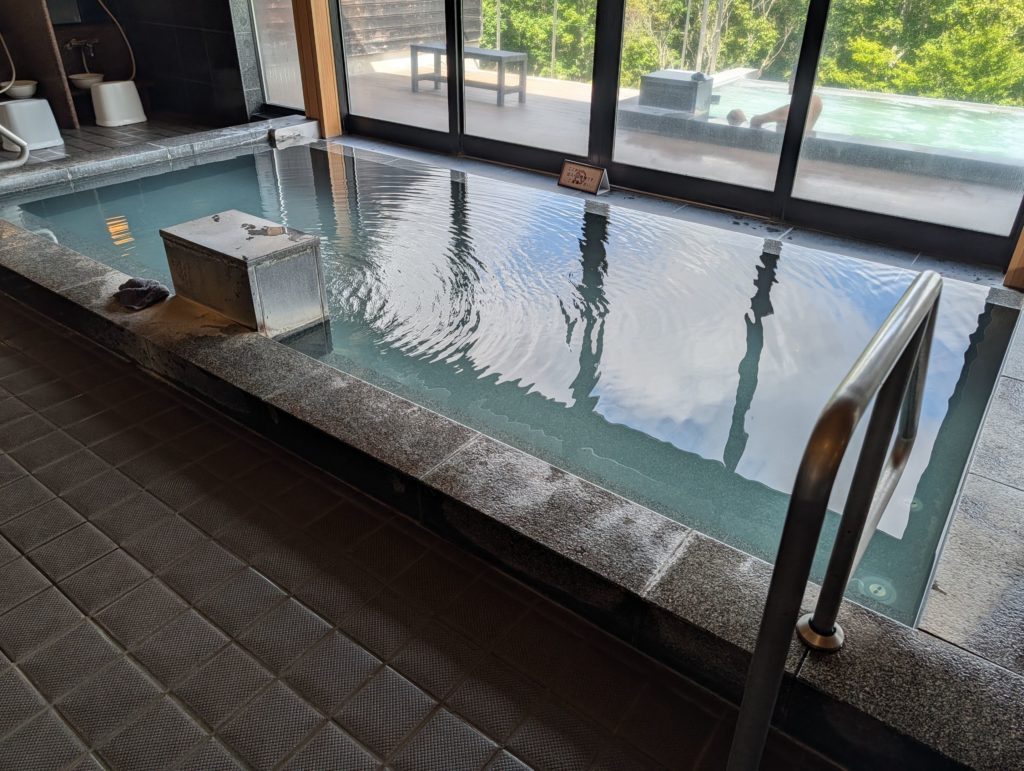 奥岳の湯は清潔感あふれる施設で、内湯と露天風呂がありました。安達太良山の登山道沿いにある「くろがね小屋」の付近はかなり強い硫黄の香りが漂っていたので、ここもまた硫黄の香りが漂う硫黄泉なのかと思いきや、不思議と無臭。そのうっすらと青白いお湯は舐めてみても酸味とエグみもあるので硫黄成分を含むのは間違いないのですが不思議な感じです…