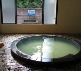 三朝温泉にはいくつかの共同浴場があって、菩薩の湯はその一つ。一見するとバス停のそばにある公衆トイレみたいな入り口から入ると普通の銭湯みたいに番台さんが座るような場所があって、そこで料金を支払う形。シンプルな円形の湯船には、熱めのお湯がはられている。