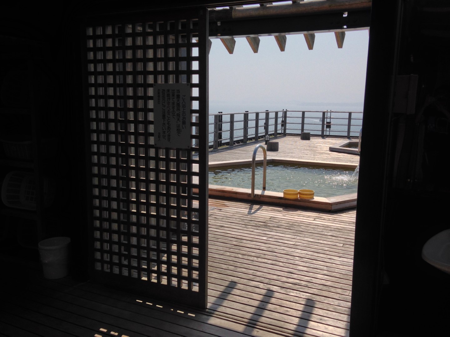 The open-air bath on the rooftop boasts an incredible view right from the dressing area, instantly boosting my excitement. Stepping outside, the breathtaking panorama of Lake Hamana spread below made the location truly special. However, today was incredibly hot – nearly 40°C – with no shade at all. The extreme heat combined with high bathwater temperatures made it impossible to relax and enjoy the soak.