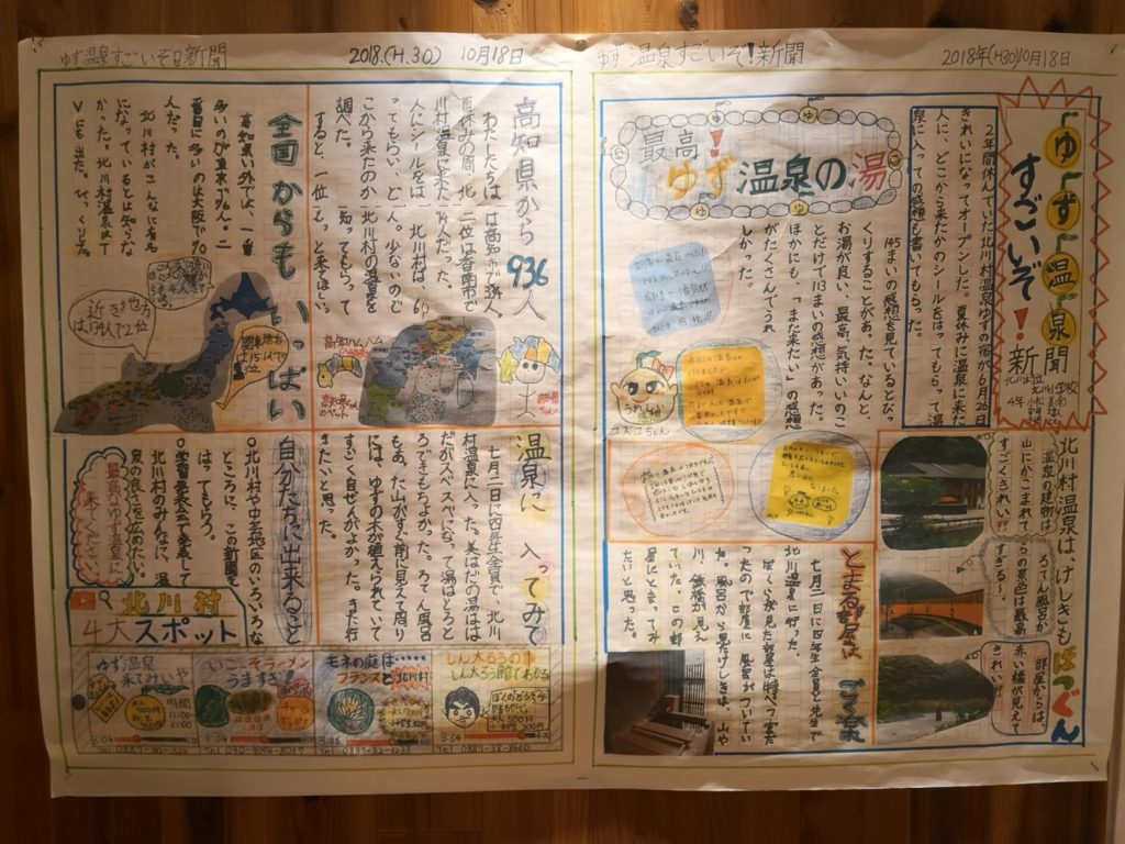 I also enjoyed reading the local yuzu-themed newspaper created by elementary school students, which was posted around the inn. It was a nice touch to promote Kitagawa Village to visitors from Kochi. There were also many yuzu-based souvenirs for sale at the inn, and I ended up buying quite a few. My favorite was the “yuzu vinegar,” a tangy mixture of yuzu juice and salt, which tastes great on almost anything. I had seen yellow liquid in a soy sauce bottle during my pilgrimage and wondered what it was – turns out it was yuzu vinegar! It’s a popular condiment in the area.