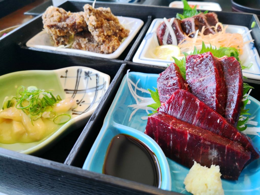 During my pilgrimage, I passed by Kiramesse Muroto, but it was closed at the time. This time, I was able to stop by and enjoy a whale set meal. We also spent some time playing on the rugged rocks with my child.