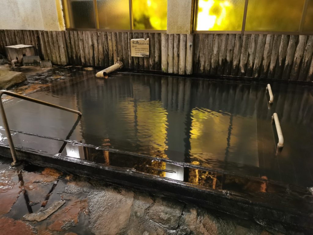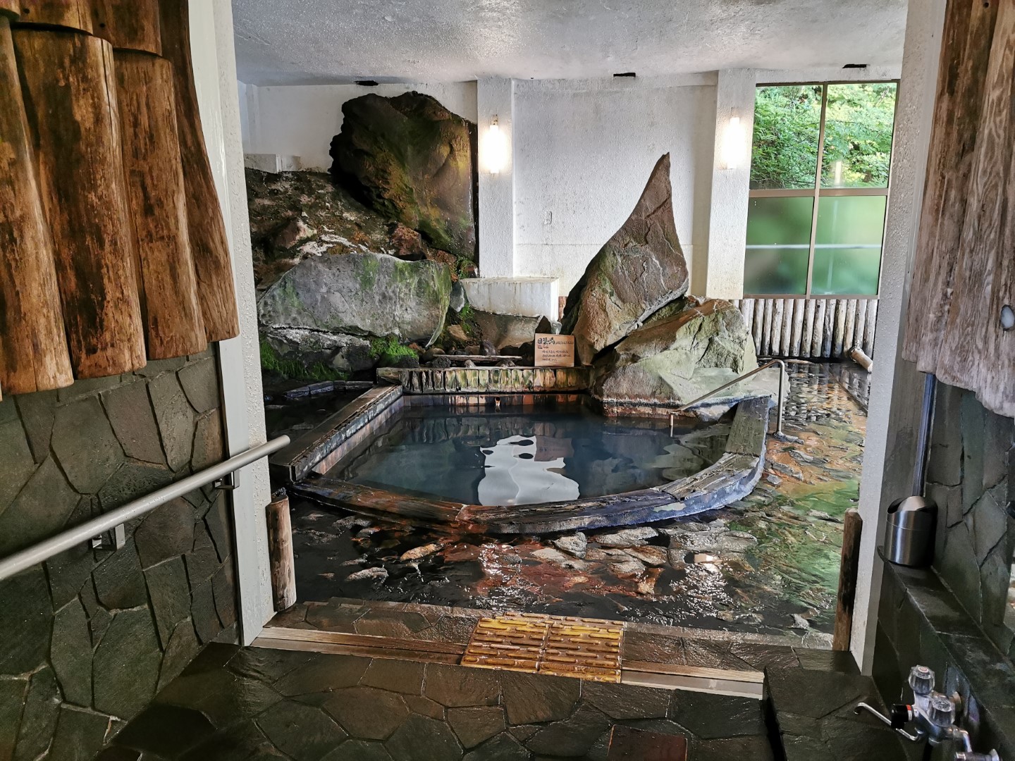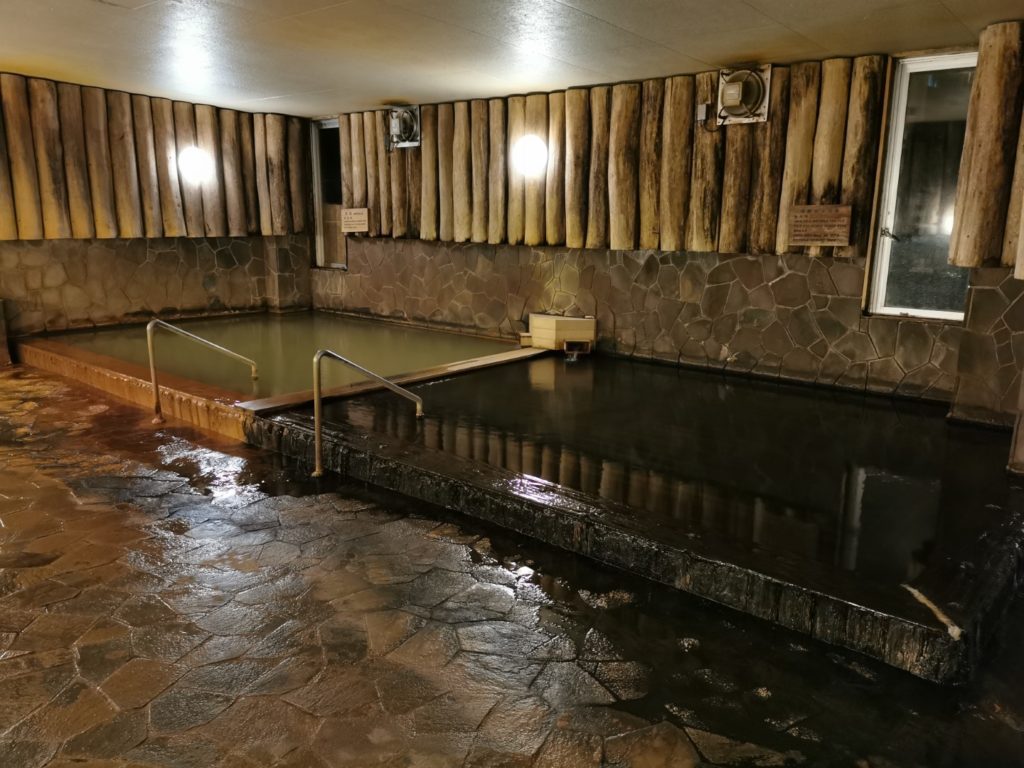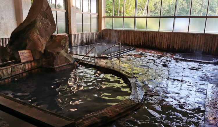 At Yukoman-so, there’re “Kamigami-no-yu”, “Yukoman-no-yu” and “Shikoro-no-yu”, each of which has several different types of hot springs to enjoy. Personally, I particularly like the bicarbonate of soda spring (in the middle of the upper row in the photo) and the sulfate spring (not shown in the photo, but in the “Kamigami-no-yu” which is under renovation). Both of these springs are lukewarm, so they don’t put too much stimulus on the body, and you can really enjoy like forever. The sulfate spring bath in “Kamigami-no-yu” has a characteristic black bathtub with a rugged wooden surface, which also has a nice atmosphere.