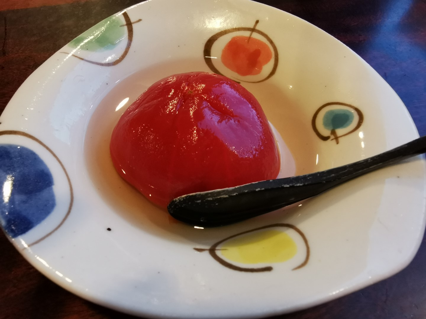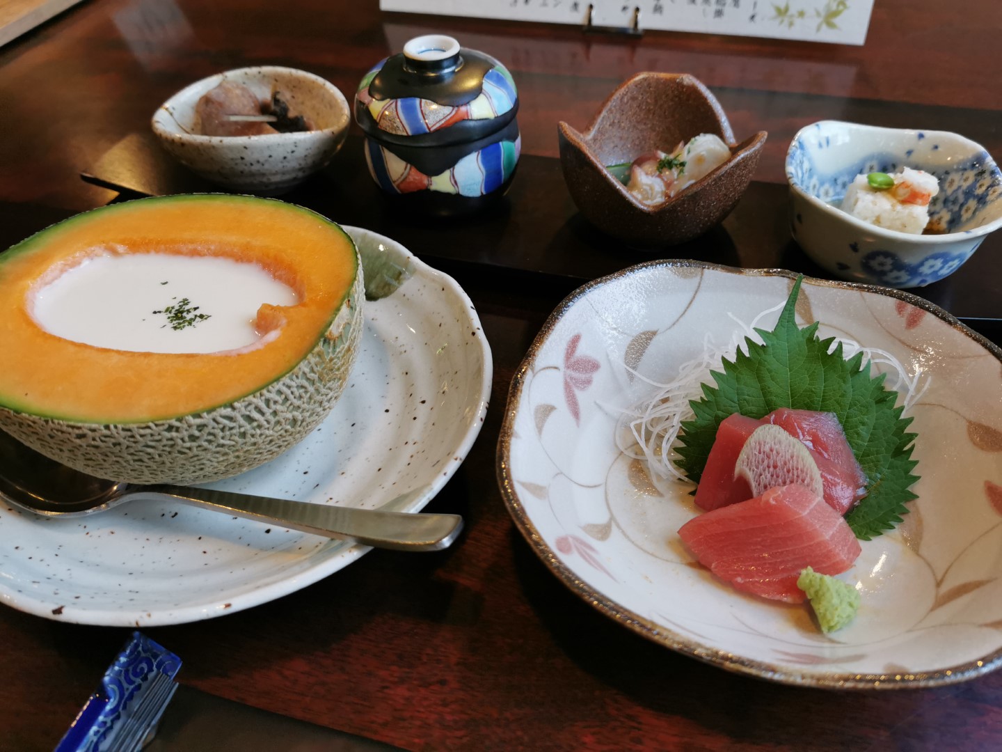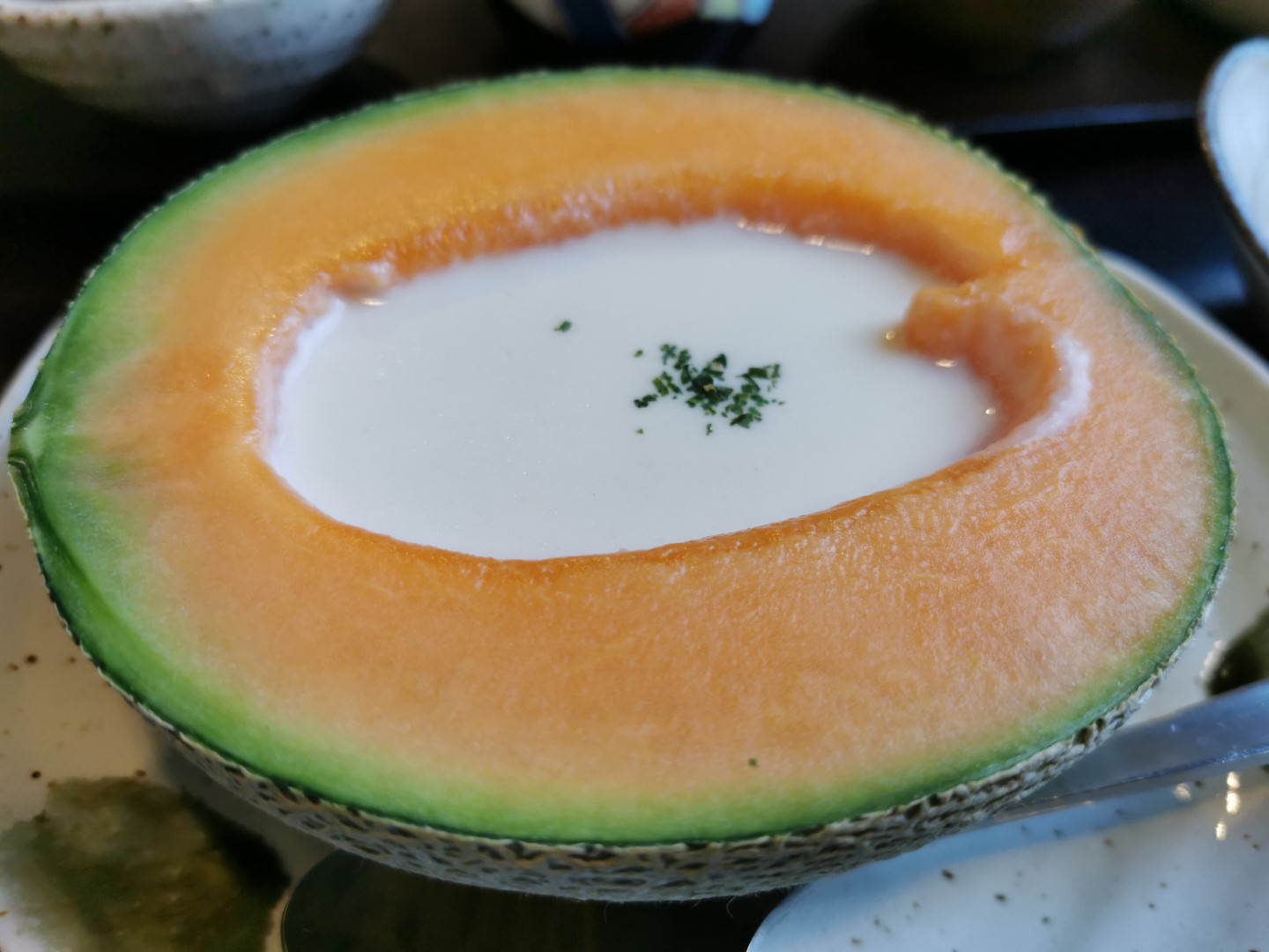 I’ve had “Yushoku-zen” many times. One of my favorites during the summer season is “Local Melon and Vichyssoise”. It is served as an appetizer, and it is as large as it looks. However, I can easily finish it since it’s just delicious. Another dish that makes me unconsciously happy every time is the white wine stewed ripe tomatoes, elegantly sweet and chilled to perfection. Even the pure white coffee jelly served for dessert is a familiar dish, but I really never get tired of it.
